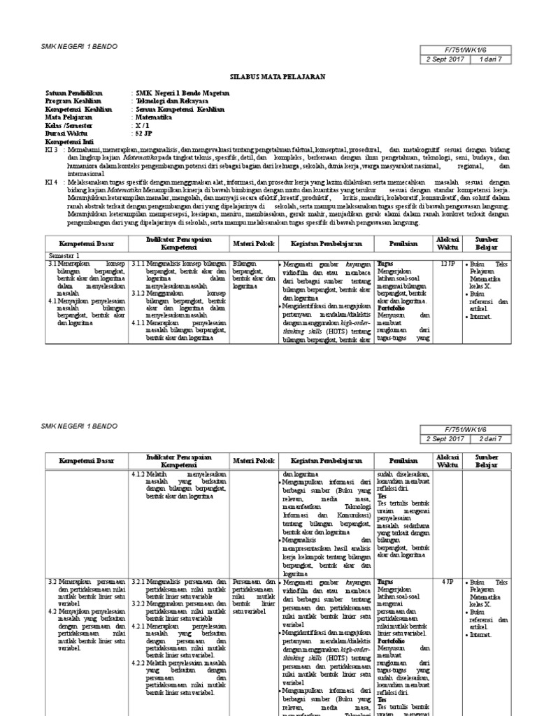 Silabus k13 smk matematika kelas xii, download. Pada postingan kali ini admin akan berbagi silabus kurikulum 2013 khusus kelas 3 (tiga) sd yang tela. Silabus matematika kelas 6 kurikulum 2013 revisi 2018 semester 2 dipakai untuk membantu bapak dan ibu dewan guru dalam menyusun rpp atau perangkat pembelajaran metamtika kelas 6 semester 2 tahun aliran 2018/2019. Silabus matematika k13 kelas 7 semester 1&2 edisi revisi 2020 ini merupakan perangkat pembelajaran yang sangat penting bagi seorang guru sebab melalui perangkat pembelajaran silabus maka kita dapat mengetahui materi apa saja yang akan kita jabarkan ke dalam rencana perangkat. Apabila bapak/ibu guru mau mengunduhnya bisa menekan link yang ada di bawah ini.
